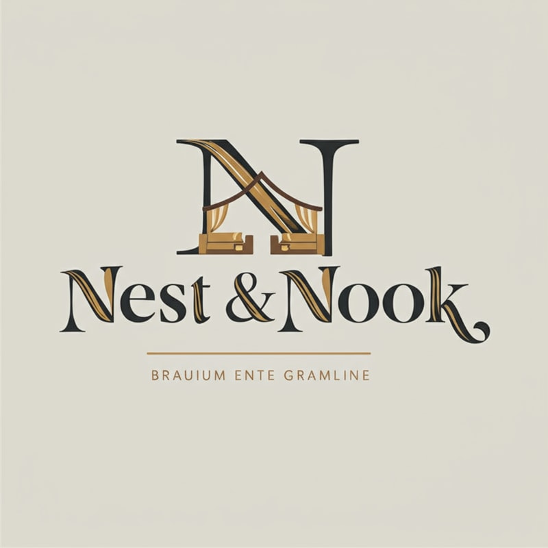 Striking modern logo for "Nest & Nook". Strong serif font with subtle custom curves resembling fabric folds. Icon of a stylish recliner chair integrated with the letter "N". Rich palette: deep charcoal + brushed gold. High-end furniture & interiors brand style.