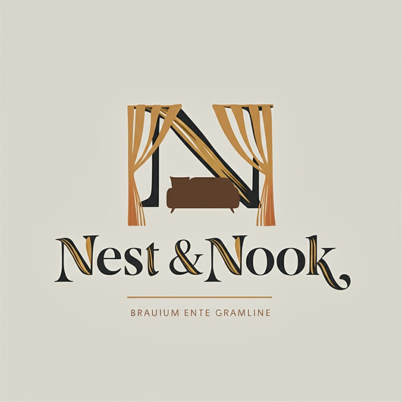 Modern abstract logo for "Nest & Nook". Icon of a home outline merging with a soft sofa silhouette and flowing curtain curves. Warm earthy tones (beige, charcoal, muted terracotta). Clean sans-serif typography below. Friendly yet premium look.