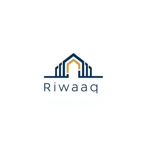 Professional logo design. Minimalist for a contemporary Arabic design studio named "Riwaaq": Abstract architectural lines, subtle gold and deep navy, elegant and modern sans-serif font. Design with an influence of Islamic geometric patterns and Bauhaus style, visual execution with clean, interlocking shapes and precise lines, on a plain white background.