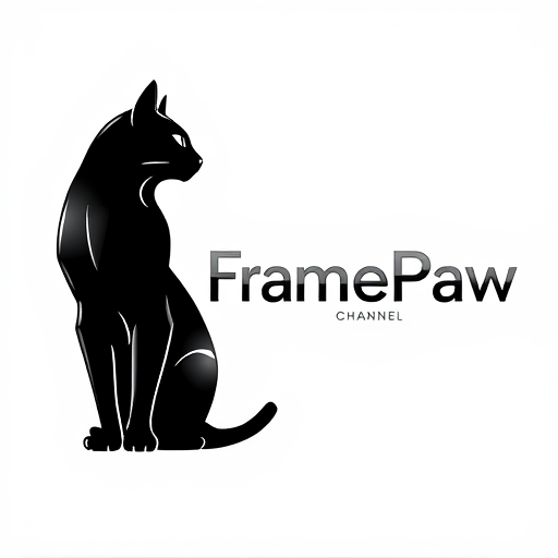 Professional logo design. Pictorial logo for a YouTube channel named "FramePaw": A sleek, monocolor, simple(not cartoon), futuristic black cat, depicted in silhouette, is positioned on the left, gazing towards the right. The channel name "FramePaw" is elegantly rendered to the right of the cat. Black, gray, and metallic silver, Futurist and Art Deco, sharp geometric lines with subtle curves, clean and striking, white background
