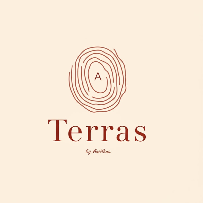 Concept: The design focuses on the deeply personal act of a maker's hands shaping the clay. The thumbprint represents the human touch and the uniqueness of every handmade piece. Elements and layout Central graphic: An imperfect, abstract, and spiraling shape that subtly mimics a thumbprint. The line of the spiral should have varying thickness, with a slightly wobbly or uneven feel, like a finger pressed into soft clay. The center of the spiral should resolve into a tiny, elegant, and abstract letter 'A,' representing Asritha's personal signature. Font choice: "Terras": Positioned clearly below the graphic. Use a clean, modern, and simple sans-serif font, such as a thin weight of Montserrat or Raleway. The simple typography allows the intricate graphic to be the focal point. "by Asritha": Place this secondary text in a smaller, more delicate, and subtly handwritten-style font. This personal touch balances the modern feel of the main name with a sense of handcrafted elegance. Color palette: The graphic (the thumbprint) is a soft, earthy, and warm beige, reminiscent of natural, un-fired clay. The text is a deeper, dark brown, similar to the rich color of raw, wet clay. Using variations of terracotta-related hues creates an inviting and authentic feel.