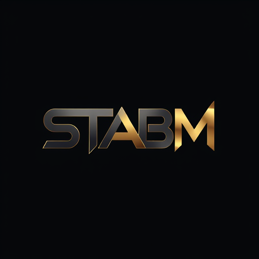 Professional logo design. Letterform for a high-end, luxury streetwear clothing brand named "STABM": The logo features bold, interconnected "S", "T", "A", "B", and "M" forming a cohesive and distinctive mark, Abstract geometric shapes inspired by modern architecture, deep charcoal grey, sophisticated gold, and a hint of electric blue, Sharp, sans-serif typography with subtle geometric flourishes, reflecting a blend of modernism and urban edge, Minimalist and impactful, with clean lines and precise angles, subtle metallic sheen on the gold elements, Solid dark background.