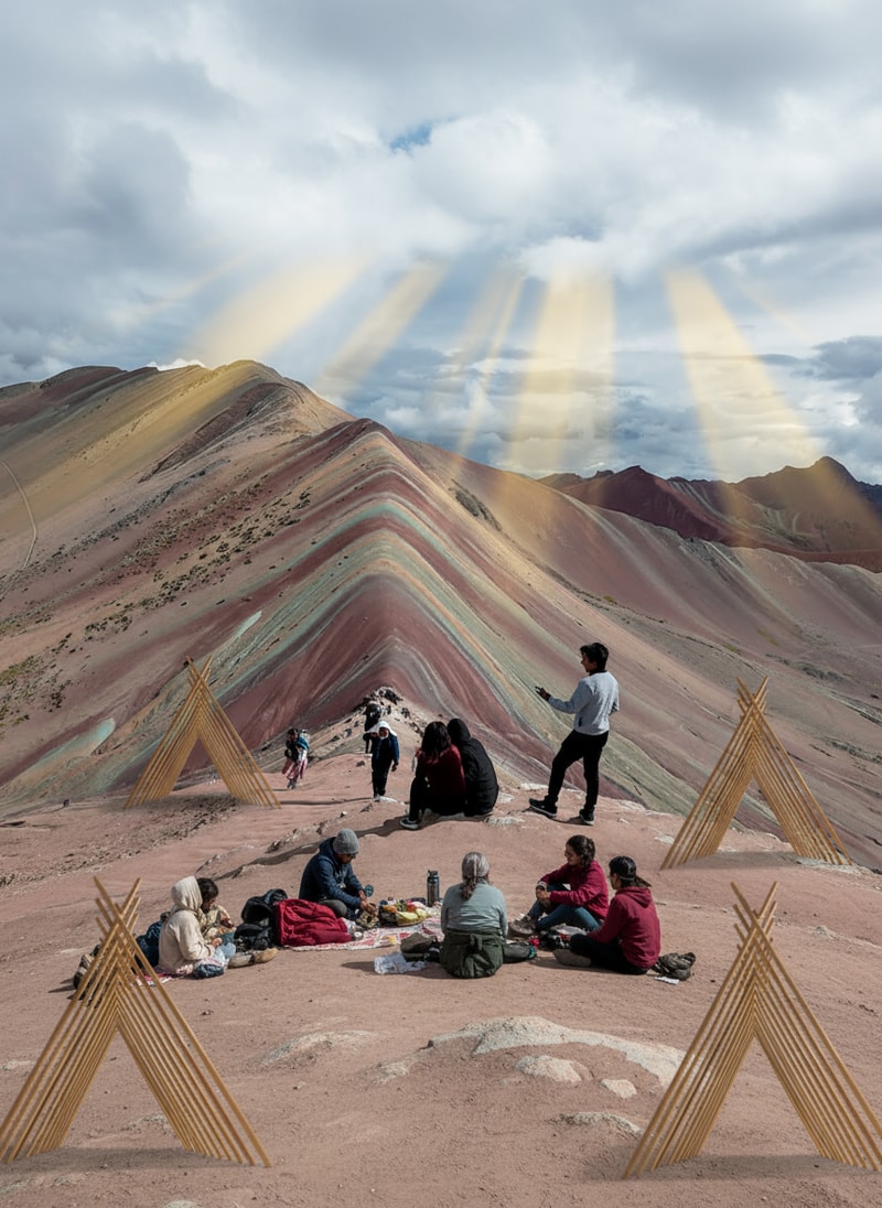 Can you make a collage for me from these two pictures, add sun rays, people relaxing, make it look professional