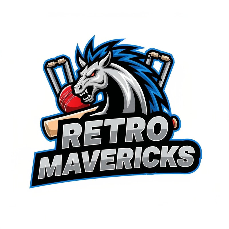 Create a powerful cricket team logo for “RETRO MAVERICKS”. Mascot: a fierce wild horse (maverick), stylized and dynamic. Integrate cricket elements: cricket ball, wicket stumps, or bats. Color palette: black, silver, electric blue. Retro bold lettering for the team name. High-energy sports team logo, sharp edges, mascot-driven style. No background, vector-style, clean finish.
