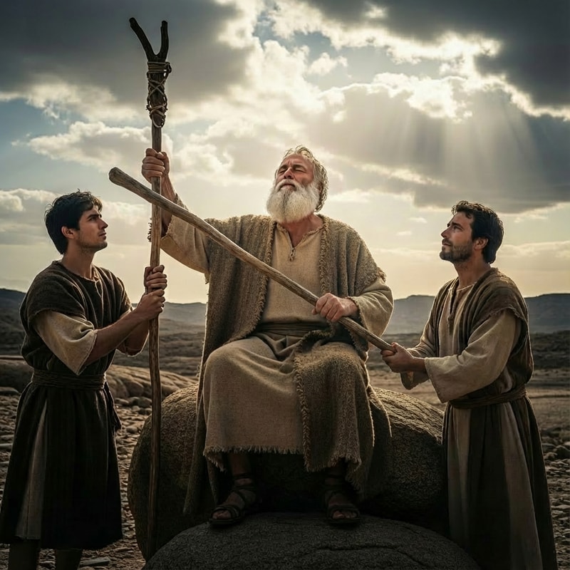 make Moses holding the staff with two hands, the rod in the middle