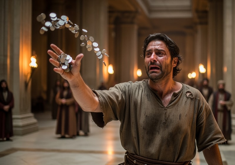 Juda Iscariot throwing the coins in th etemplepicture of a person who has a tragedy