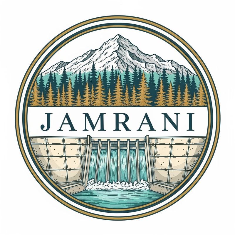 “Create a circular premium logo for the brand JAMRANI. Inside the circle, illustrate a majestic snow mountain, dense pine forest, and a wide geometric dam in the mid-ground. Below the dam, show clean flowing turquoise water. Use an engraved, vintage-illustration style with soft gold and teal gradients. Place the brand name JAMRANI in elegant serif lettering across the center, integrated with the illustration but not covering the dam fully. Add a double gold outer ring with subtle shadows. Mood: natural, classic, trustworthy spring-water identity.”