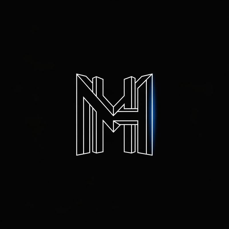 “Minimal, architectural monogram logo combining the letters M and H in a single geometric symbol. Created using sharp, clean white line-art on a deep black background. The design should resemble modern building architecture, with vertical pillars forming the H and angled structural beams forming the M. Thin precise strokes, accurate perspective, and perfect symmetry. Add a subtle neon-blue highlight on one corner or intersection for a premium blueprint aesthetic. Ultra minimal, modern, vector-style line-art, centered composition, high resolution.”