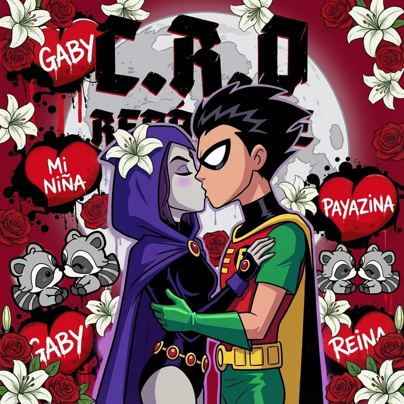 ahora haz que en el centro de la imagen haya una luna detras de raven y robin, y que encima de raven y robin este las letras de C. R. O. de la segunda imagen
