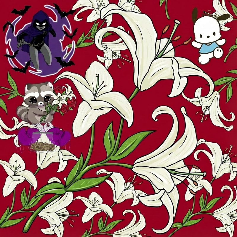 haz que la imagen 2 este abajo del mapache, solo quiero la silueta de los guantes y la bolsa, no quiero que aparezca el fondo. Los guantes tienen que estar debbajo del mapache y mas pequeños