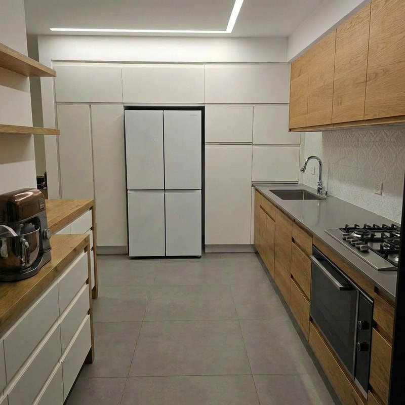 Edit the kitchen image so the green cabinets are changed to natural wood, matching the same wood tone and finish as the surface above the cabinets on the opposite side of the kitchen. Replace the wall tiles with white ceramic tiles featuring a more refined, subtle, and elegant pattern. Keep the overall design cohesive, realistic, and consistent with the original lighting and proportions.”