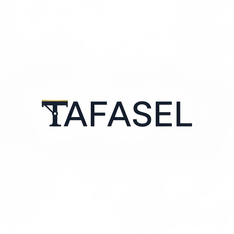Design a modern, minimalist wordmark logo for a general contracting company named “TAFASEL”. The logo must be text-based only, using the word TAFASEL as the full logo. Focus on the first letter “T” by giving it a subtle, clever modification that reflects construction or engineering (e.g., structural balance, beam alignment, modular connection, or architectural form), without making it complex or decorative. The “T” should feel integrated, strong, and slightly distinctive, but still clean and professional. Style & Direction: Minimalist, corporate, high-end Clean geometry, sharp edges, precise spacing Inspired by engineering, structure, and stability No icons, no symbols, no extra graphics — only typography Colors: Use deep, rich tones (not light colors) such as: Dark navy Charcoal black Deep steel blue Subtle metallic gold accent (optional, very minimal) Avoid bright or washed-out colors Background: Pure white background only Typography: Custom sans-serif or geometric font Balanced letter spacing Slight bold weight to reflect strength and reliability Output: Centered composition High resolution Flat design (no mockups, no shadows, no textures) Clean vector-style appearance