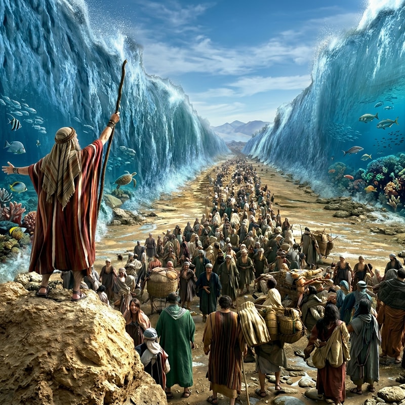 AI image design: make the marked people down to look forward away from moses on the rock, fix the picture, sharpen the picture